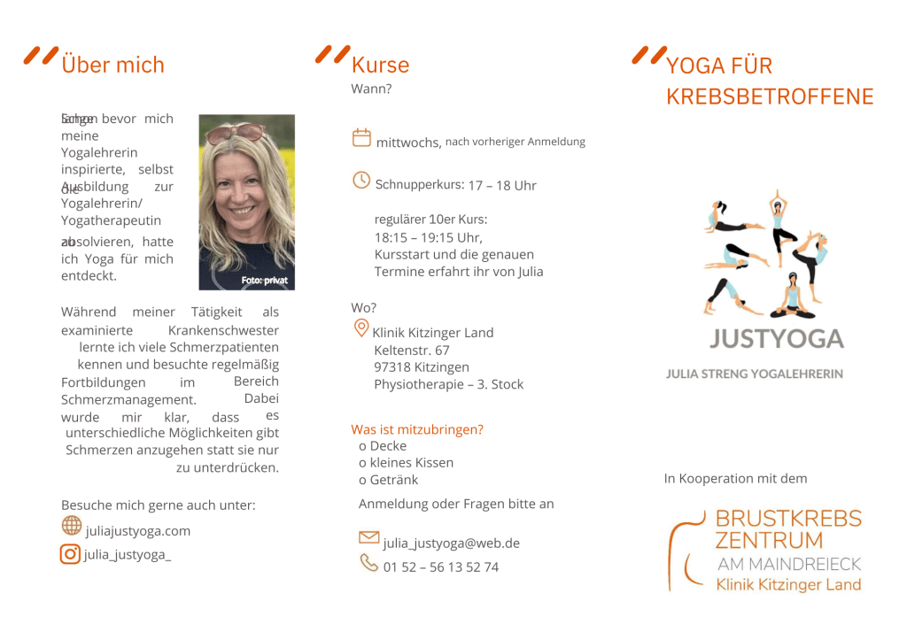Home YOGA MIT JULIA Warum macht Yoga glücklich? Wer Yoga praktiziert, der bekommt ein besseres Lebensgefühl und Bewusstsein für seinen Körper. Mehr MEIN YOGA „Mein Unterricht ist sehr klassisch aufgebaut, die Körperübungen (ASANAS) auf Hatha Yoga Basis werden erst leicht ausgeführt und mit der Zeit komplexer. Mein Wissen im therapeutischen Yoga fließt in allen Stunden mit ein.“ Mehr AKTUELLE KURSE Hatha Yoga in Obereisenheim in der Praxis für Naturheilkunde Caroline Schanz Neue Kurse/Freie Plätze Workshops Anmelden YOGA AUF DEM WASSER Termine KONTAKT Kontakt aufnehmen Julia StrengZiegeltorstraße 797247 Untereisenheim julia_justyoga@web.de 0152/56135274 Instagram YouTube ← ZurückVielen Dank für deine Antwort. ✨ Name(erforderlich) Email(erforderlich) AbschickenEinreichungsformular Δ